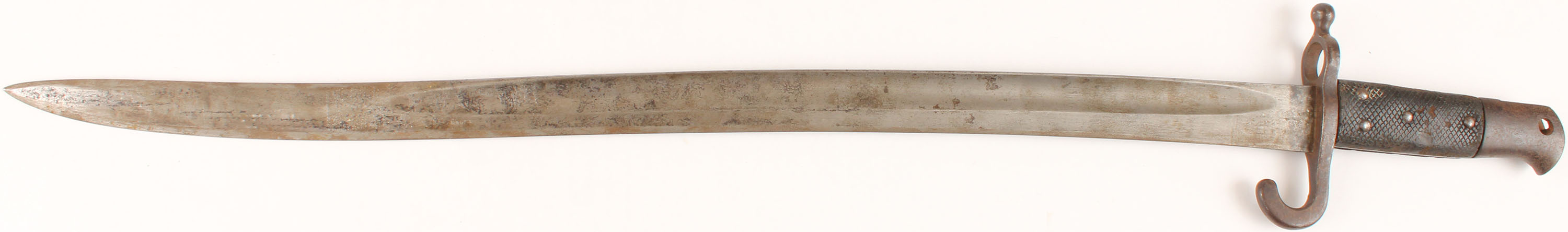 Austrian, M1867 Sword bayonet, RARE original full length blade, Left side of blade is marked ''STRIBERNY.ST.'', right side of blade is marked, ''GF'', & stamped with a Austrian eagle, right side of guard is marked ''68.Z'', ''121'', blade has patina, missing detachment button. Grade: Very Good - Value: 150 to 300
