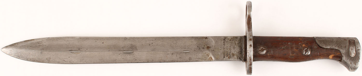 Mauser, Export bayonet, Left side of blade marked, ''WAFFENFABRIK'', ''MAUSER AG.'', ''OBERNDORFA.N.'', spine is marked crown over ''W'', ''17'', blade has slight rust speckles & patina. Grade: Very Good ++ - Value: 20 to 60