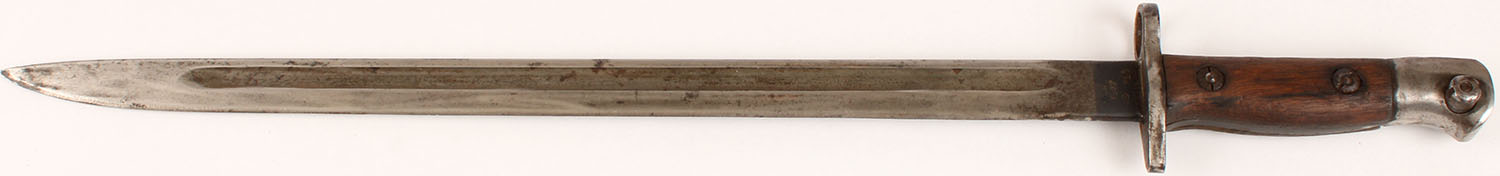 British, Sanderson, pattern 1907 bayonet, Left side of blade is marked with Crown over ''G.R.'', ''1907'', proof marks, & '' Sanderson'', right side of blade is marked with proof marks, blade has sharping wear, & light patina. Grade: Very Good ++ - Value: 80 to 160