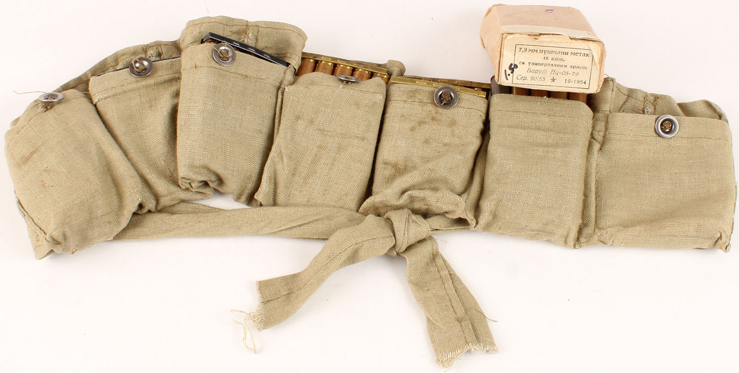 Turkish, 7 cell Bandoleer, 67 Rds. Of 8mm Mauser of mixed MFG, some Turkish, Romanian, & Yugo, all ammo is CORROSIVE, bandoleer has no markings, bandoleer has light wear, ammo is very good to excellent. Grade: Excellent + - Value: 40 to 100