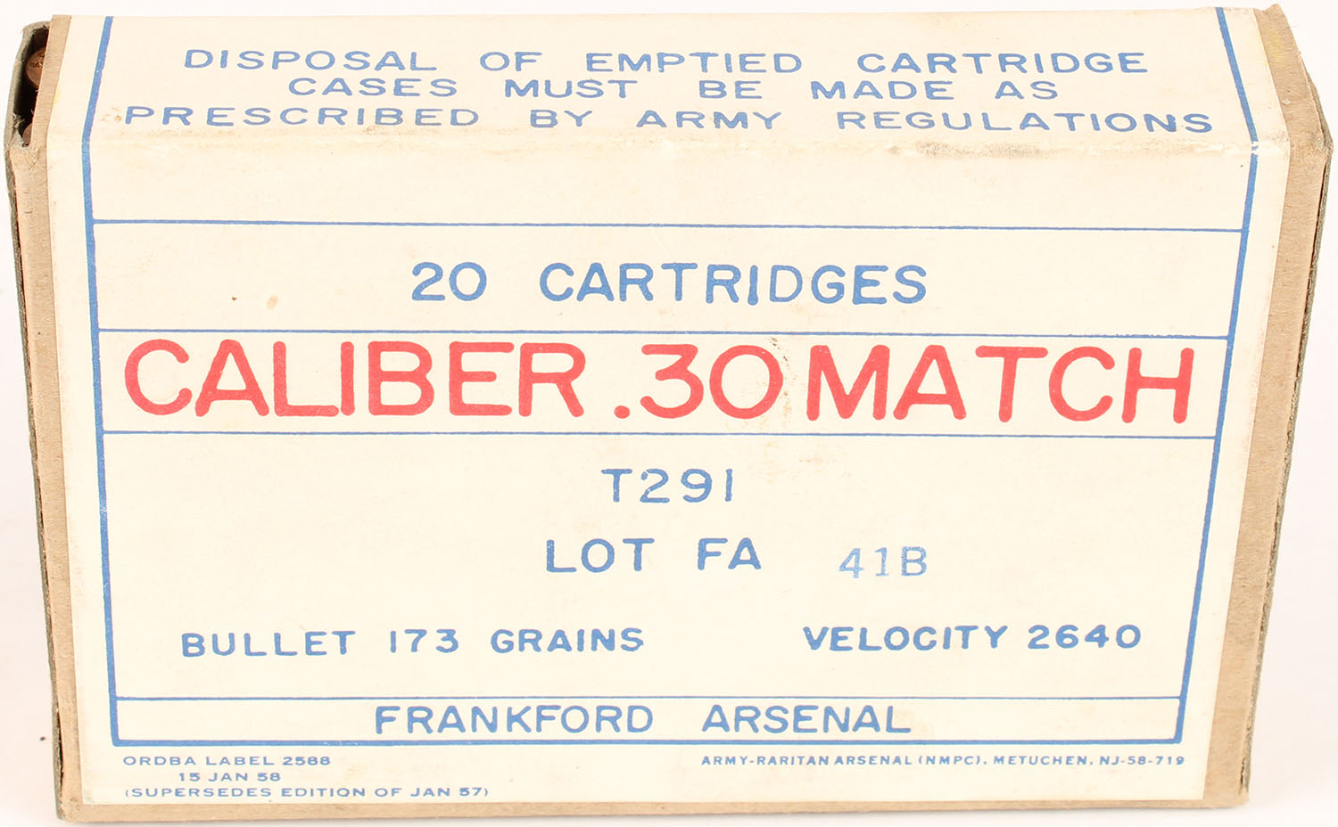 Frankford Arsenal, .30 Match T291, 173 Gr. Bullet, Lot FA 41B, 1958 dated, 1pc, FULL & SEALED, buff box with white label & blue/red print, box is solid with wear from bullets on bottom, light age soiling, light rub marks, & light edge wear. Grade: Very Good ++ - Value: 20 to 40