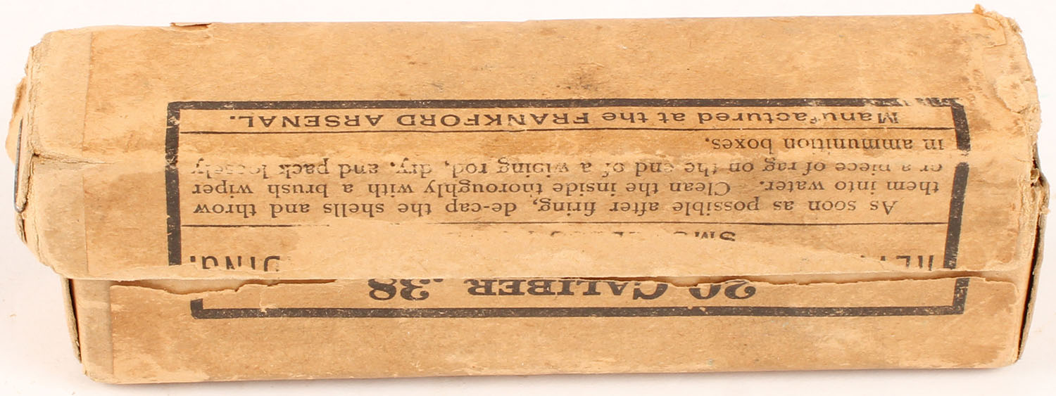 Frankford Arsenal, .38 Revolver ball, dated 1908, 2pc, Full, buff box with black label/print, box is missing one end flap on lid, three seam splits on lid, tear in front label, & light rub marks, ammo is very good to good. Grade: Very Good + - Value: 10 to 30