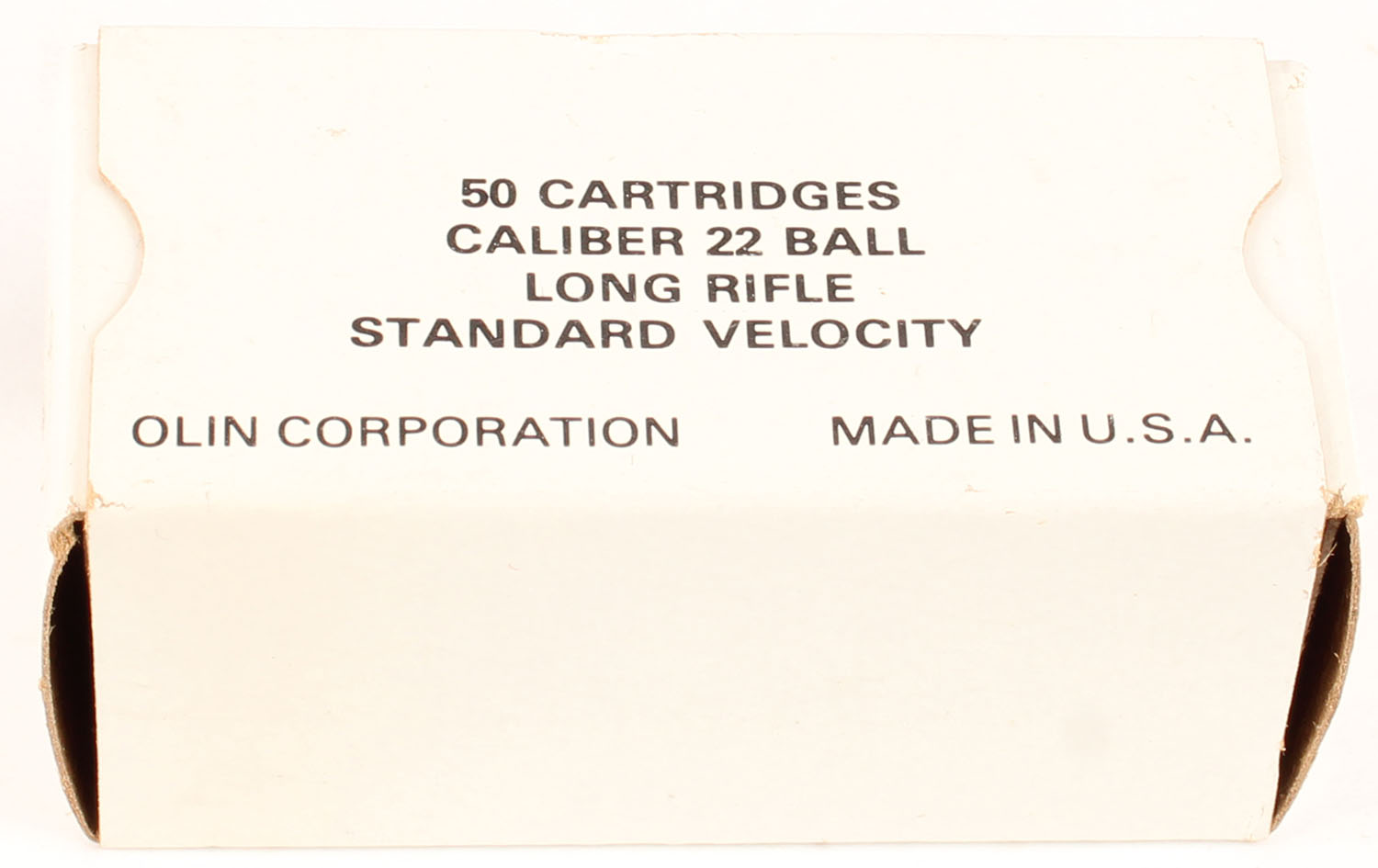 Olin, 22 LR Ball, 1pc, Full, white box with black print, box is solid with little to no wear, ammo is MINT. Grade: Excellent ++ - Value: 10 to 30