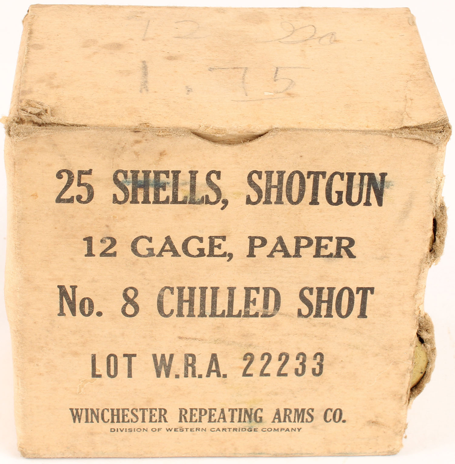 Winchester, 12 Ga, No. 8 Chilled shot, Paper shell, Lot W.R.A. 22233, 1pc, Partial 23 Rds., buff box with black print, box has seam splits from shells, pencil marks, age soiling, rub marks, & edge wear, ammo is very good. Grade: Very Good - Value: 20 to 60