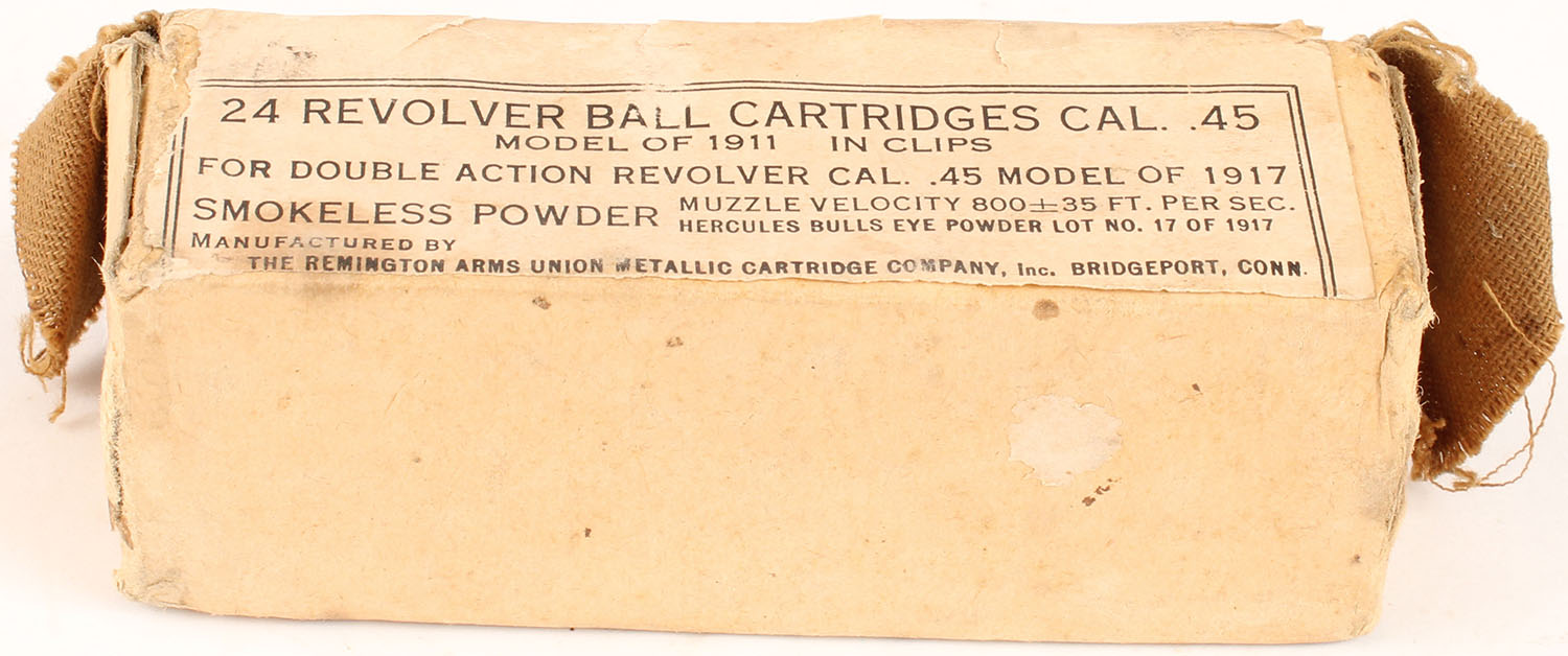 Remington, .45 Model of 1911 Revolver ball cartridges, In clips, 1pc, Full, buff box/label with black print, box is solid with light age soiling, light rub marks & light edge wear, ammo is very good. Grade: Very Good ++ - Value: 30 to 90