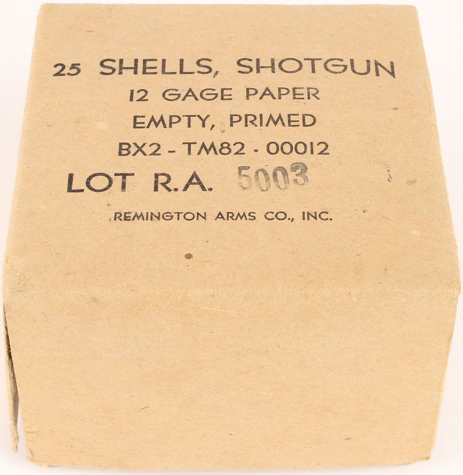 Remington, 12 Ga Empty, Primed, paper shotshells, Lot R.A. 5003, 2pc, Full, brown box with black print, box has one split corner seam on lid, light rub marks & light edge wear, shells are very good. Grade: Very Good ++ - Value: 20 to 60