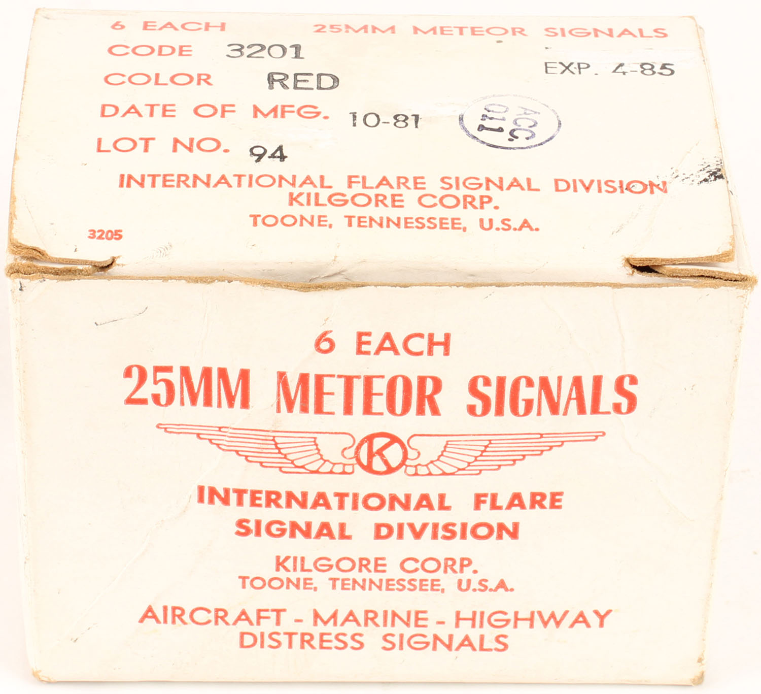 International Flare signal division, Kilgore Corp, 25MM meteor signals, Lot No. 94, 1981 dated, RED flare, 1pc, Full, white box with red/black print, box is solid with handling wear, & rub marks, ammo is excellent. Grade: Very Good ++ - Value: 20 to 60