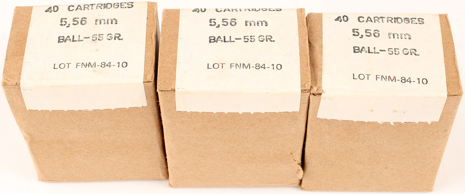 Lot of three, Portuguese, 5.56mm Ball, 55 Gr., 1984 dated, 1pc, Full, brown box with white label & black print, boxes are solid with light rub wear, & factory seal still intact, ammo is excellent. Grade: Excellent - Value: 40 to 100