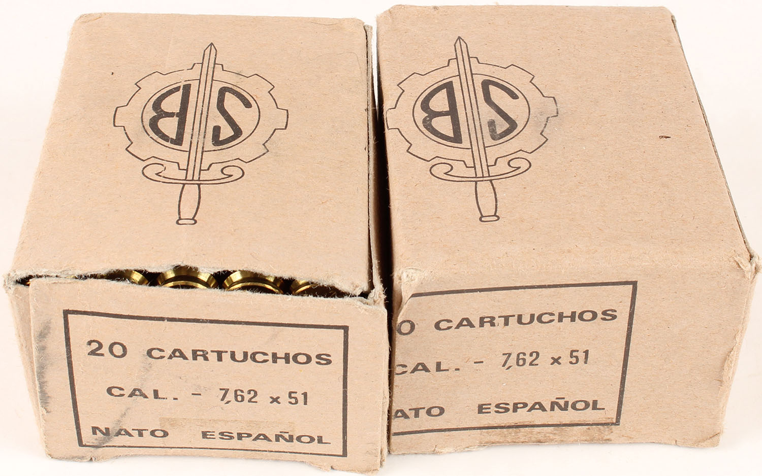 lot of two, Spanish, 7.62x51mm NATO-Spanish (CETME), 1pc, both full, brown boxes with black print, boxes are solid, ammo is excellent. Grade: Excellent - Value: 20 to 60
