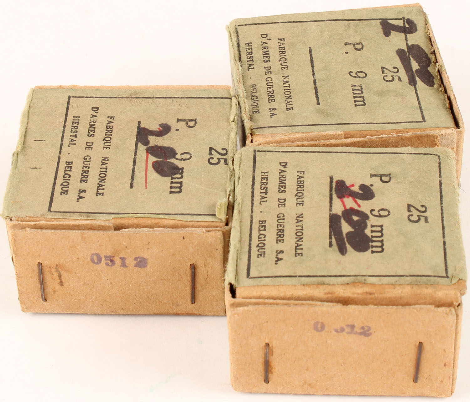 Lot of three, FN, 9x19mm, P., 1pc, all empty, buff box with green label & black print, boxes are solid with pen marks. Grade: Very Good ++ - Value: 10 to 30