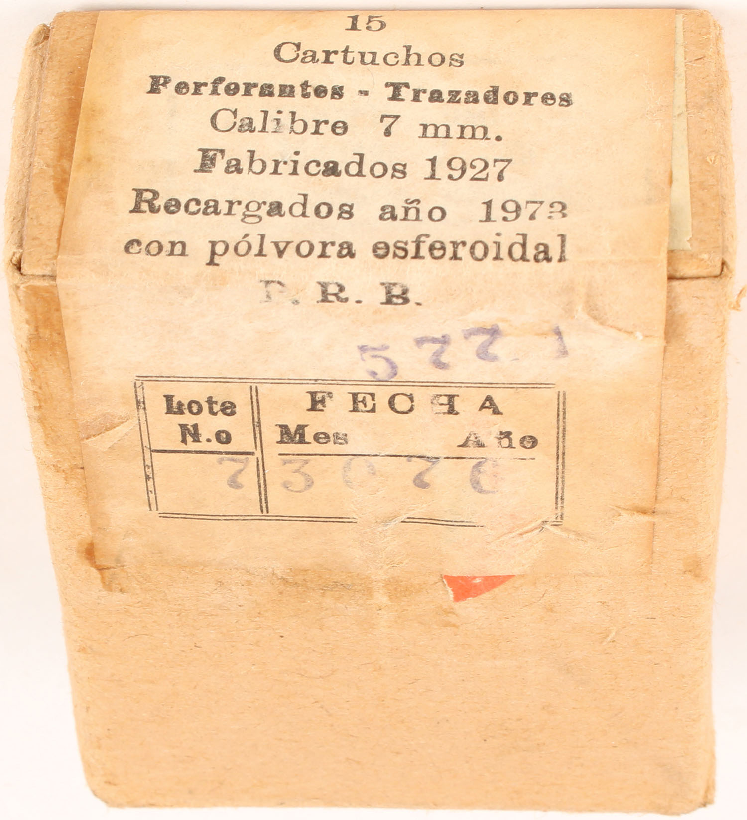 Spanish, 7x57mm (7mm Mauser), 1pc, FULL & SEALED, buff box & label with black print, box is solid with light stains, rub marks & edge wear. Grade: Very Good ++ - Value: 10 to 30