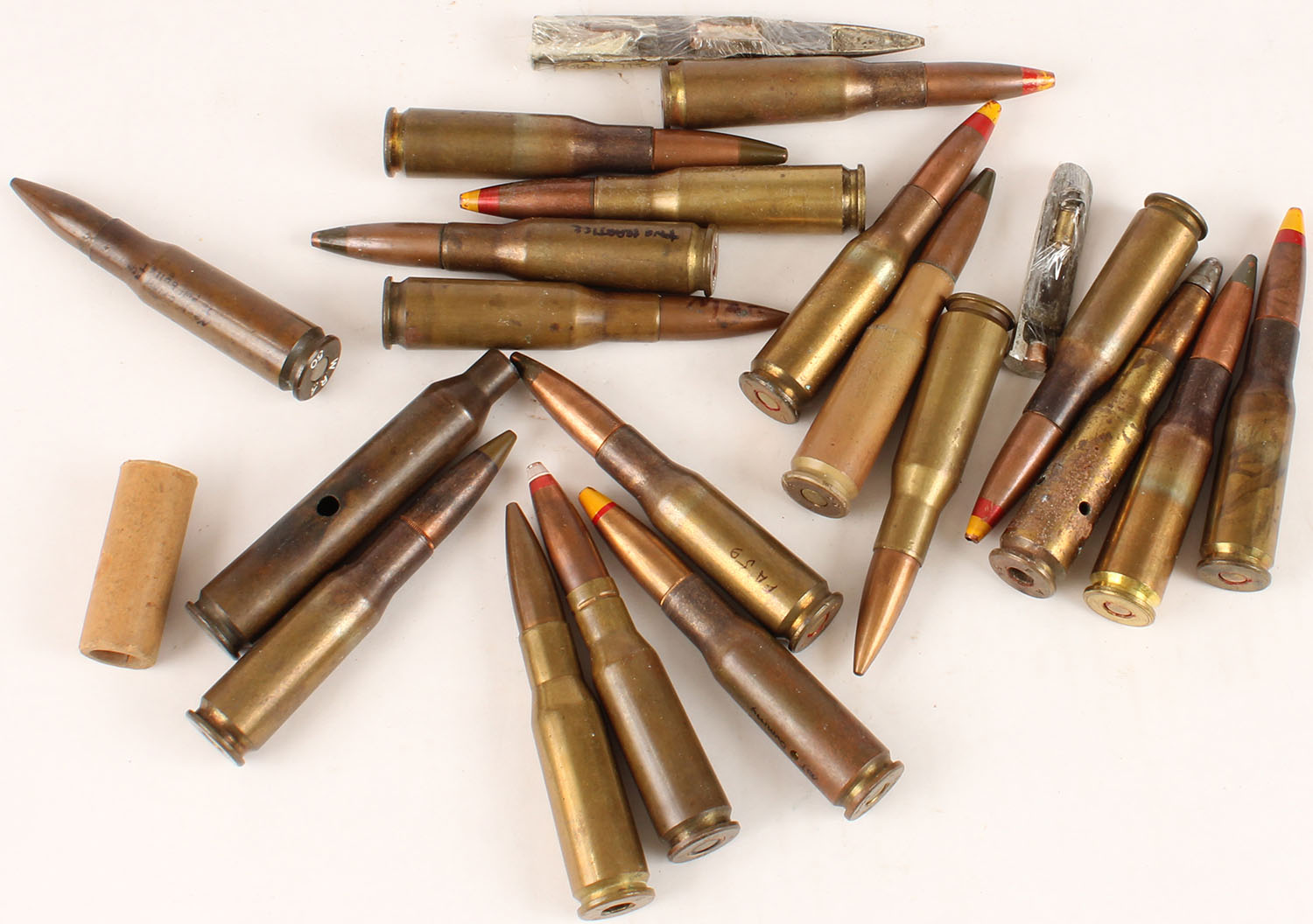 Lot of 15 Live, 6 inert, .50 cal Spotter cartridges. Grade: Very Good ++ - Value: 80 to 160