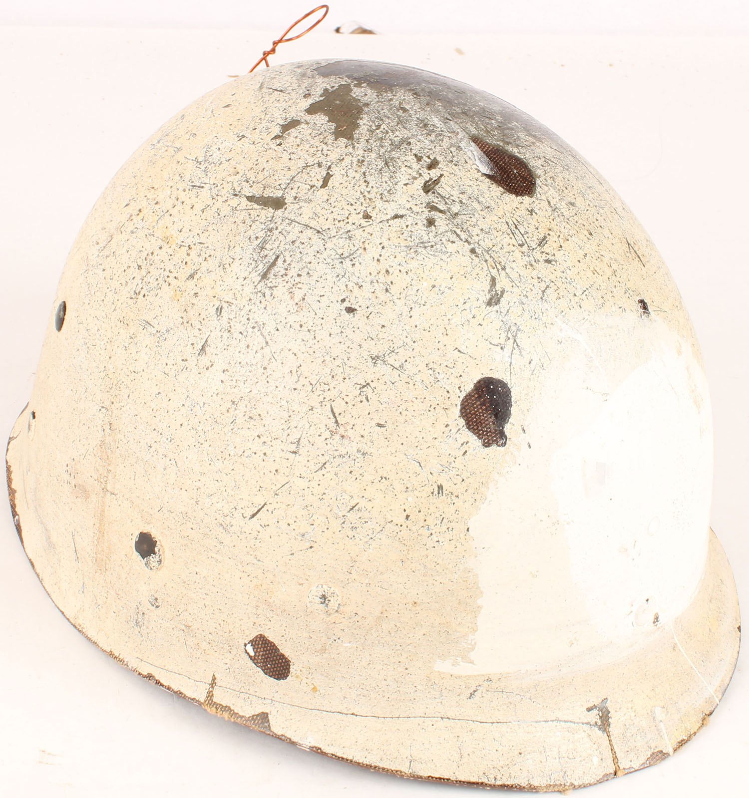 US, M1 Helmet liner, Korean war vintage, liner has been painted white, some straps on the inside has been torn off. Grade: Very Good - Value: 10 to 40