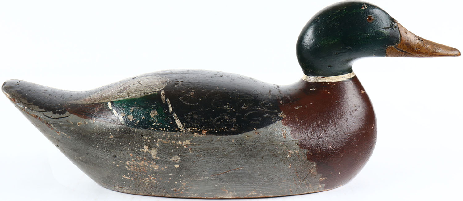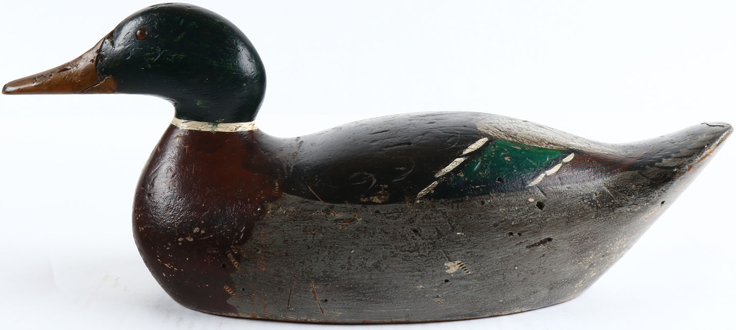 Mallard Drake, by Mason Decoy Company, Detroit, MI, 1896-1924 premier grade, glass eyes, solid wood, original paint with nice neck, shows scraps & scratches from use, structurally Excellent. Grade: Excellent - Value: 500 to 1000