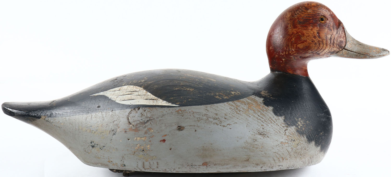 Over Sized Redhead darke by Mason Decoy Company, Detroit, MI, 1896-1924 premier grade, glass eyes, solid wood, original paint, has age crack around middle of body where the two pieces of wood come together. Grade: Very Good ++ - Value: 100 to 500