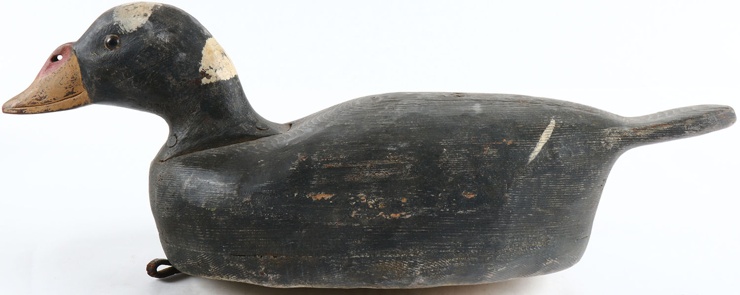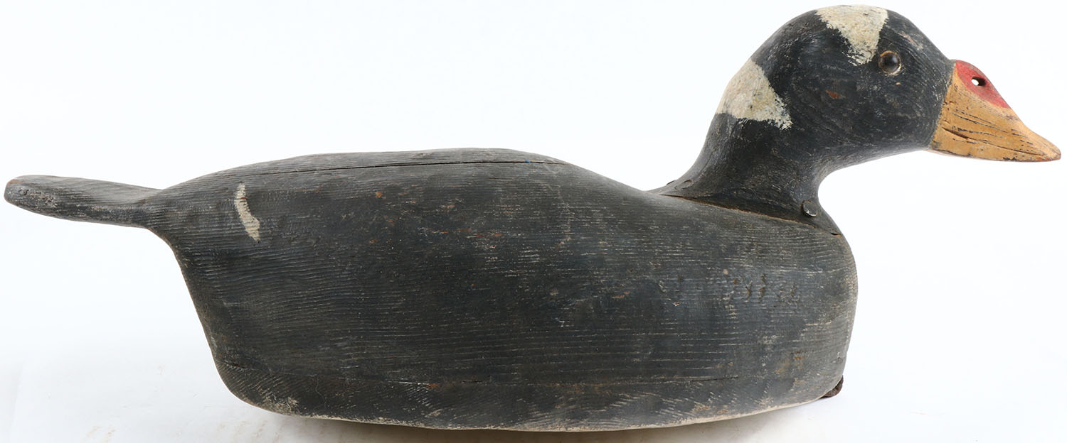 Surf Scoter by R.W. Schaap, Glass eyes, hollow wood, original paint, leather line tie, structurally excellent. Grade: Excellent - Value: 100 to 300