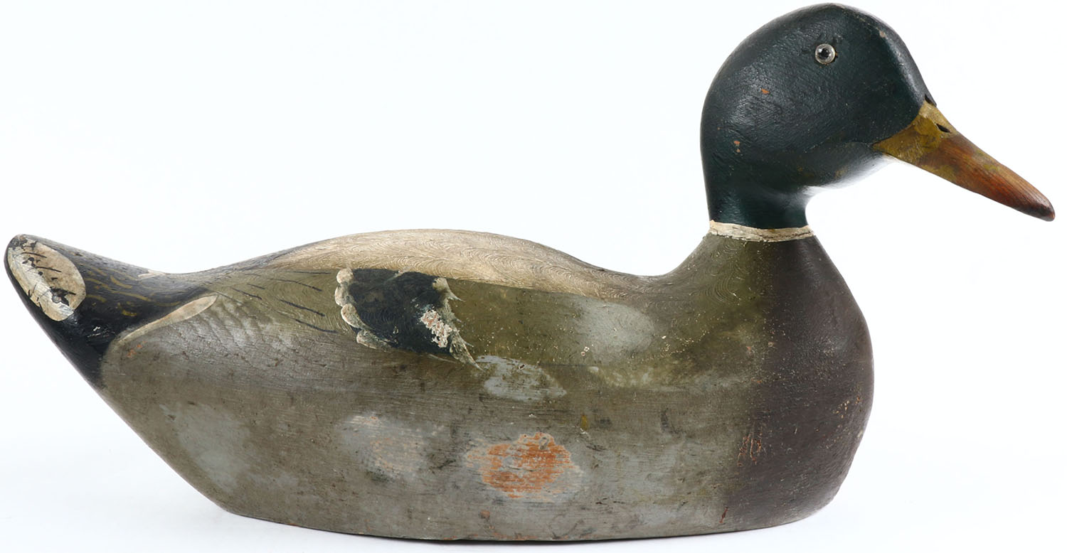 Mallard drake by Pratt Decoy Co., glass eyes, hollow body, original paint shows swirl pattern on back, some wear to top of head & right side of body, structurally excellent. Grade: Excellent - Value: 100 to 300