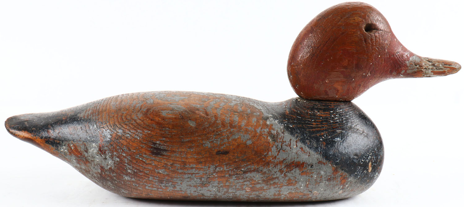 Redhead Drake made by Mason Decoy Co., 1896-1924, Standard Grade, glass eyes (one missing), solid wood, original paint shows wear. Grade: Very Good - Value: 60 to 150