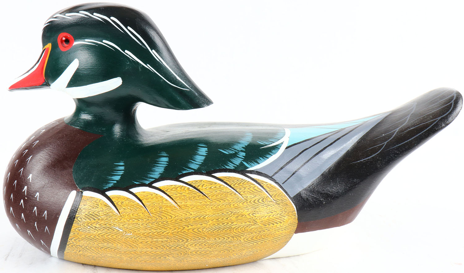 Woodduck Drake by Ed and Judy Green, Baltimore MD, glass eyes, solid wood, beautiful original paint with comb painting, structurally excellent, signed and branded on bottom. Grade: MINT - Value: 30 to 100