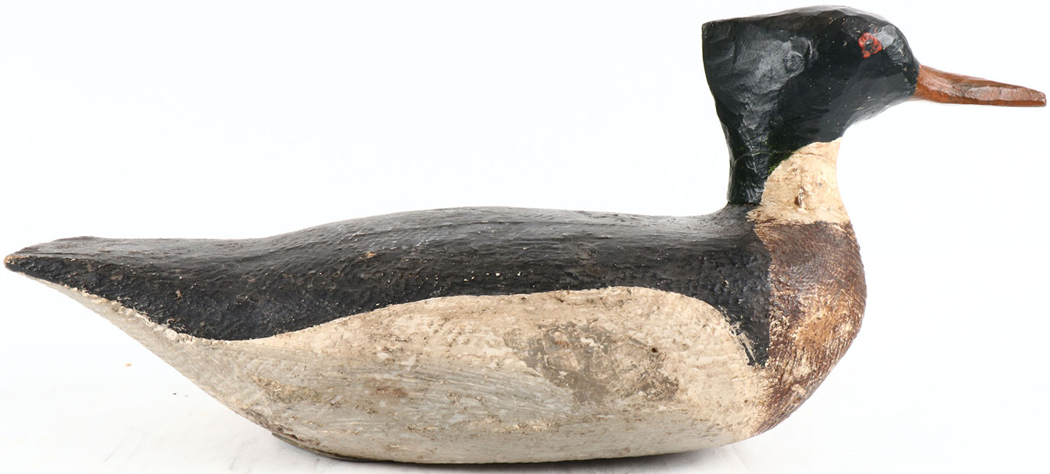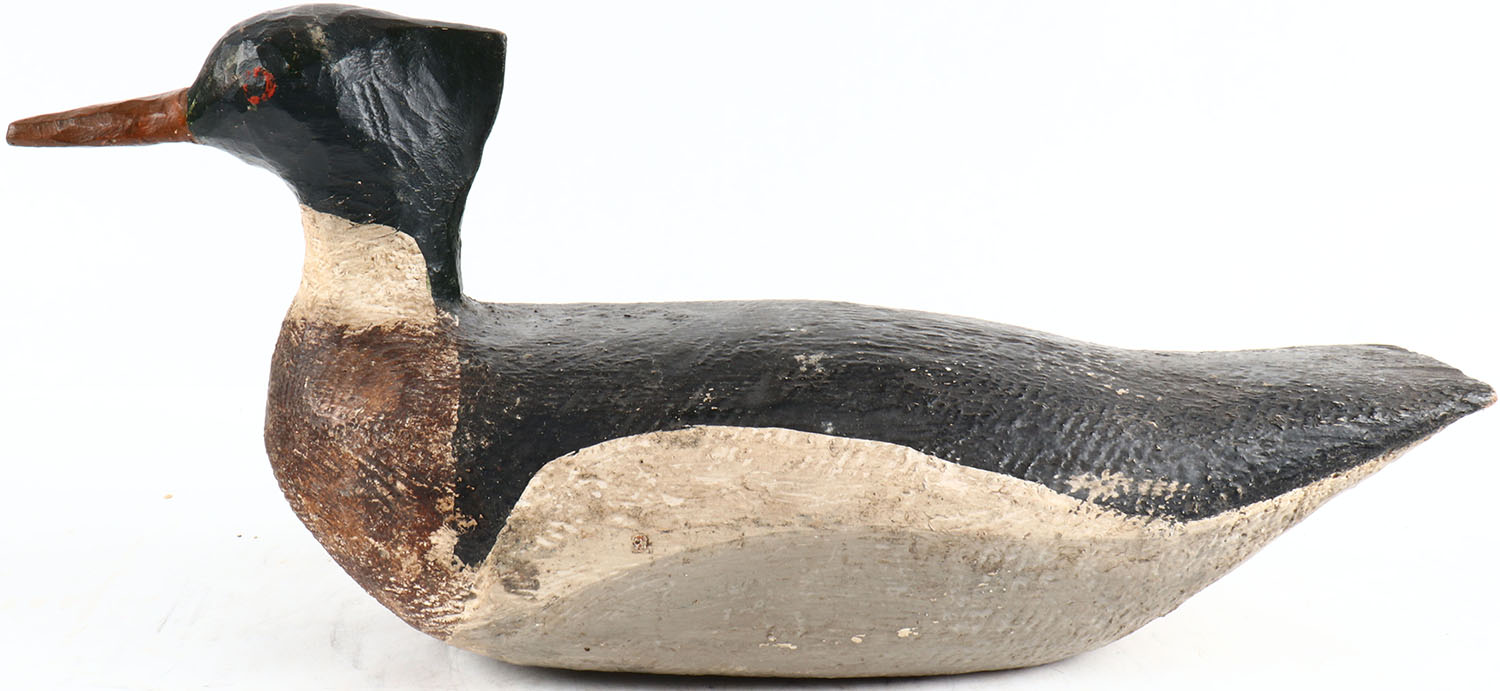 Hooded Merganser by unknown maker, painted eyes, solid wood, original paint, structurally excellent. Grade: Excellent - Value: 30 to 100