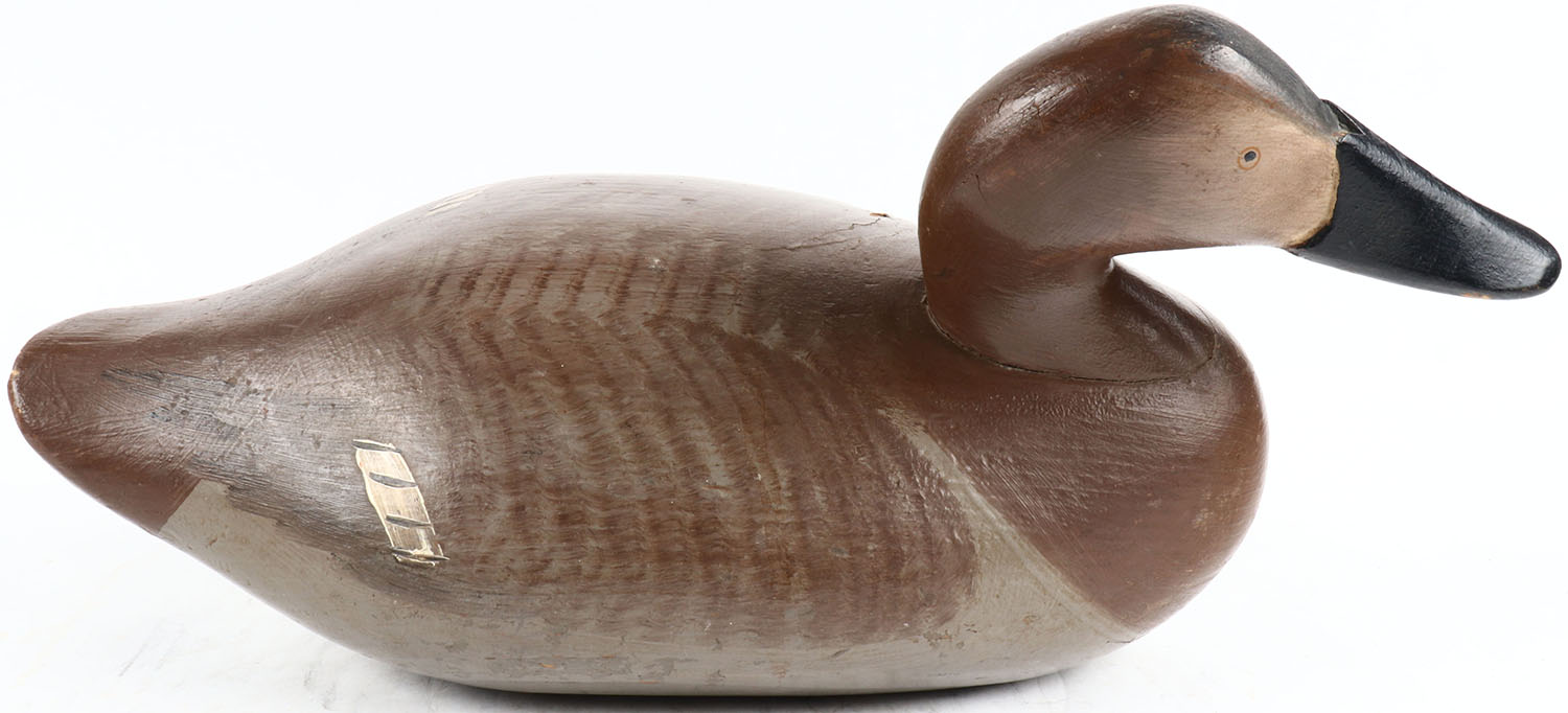 Canvasback Hen by R. Madison Mitchell, Havre De Grace MD, painted eyes, solid wood, original paint, signed & carved on bottom, structurally excellent. Grade: Excellent ++ - Value: 100 to 300