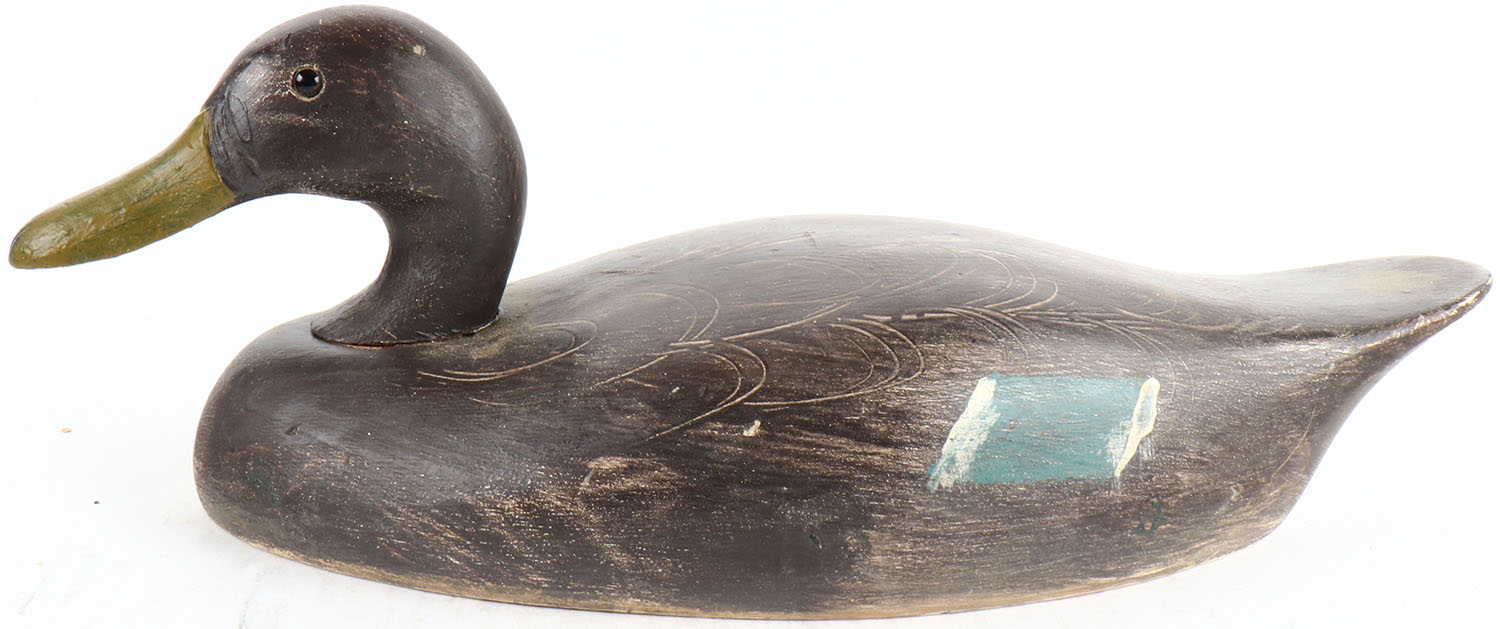 Black Duck by unknown maker, glass eyes, solid wood, original paint, head has been glued back on. Grade: Very Good + - Value: 20 to 60