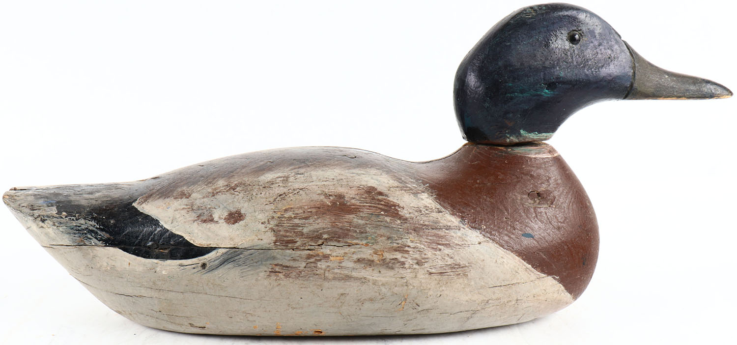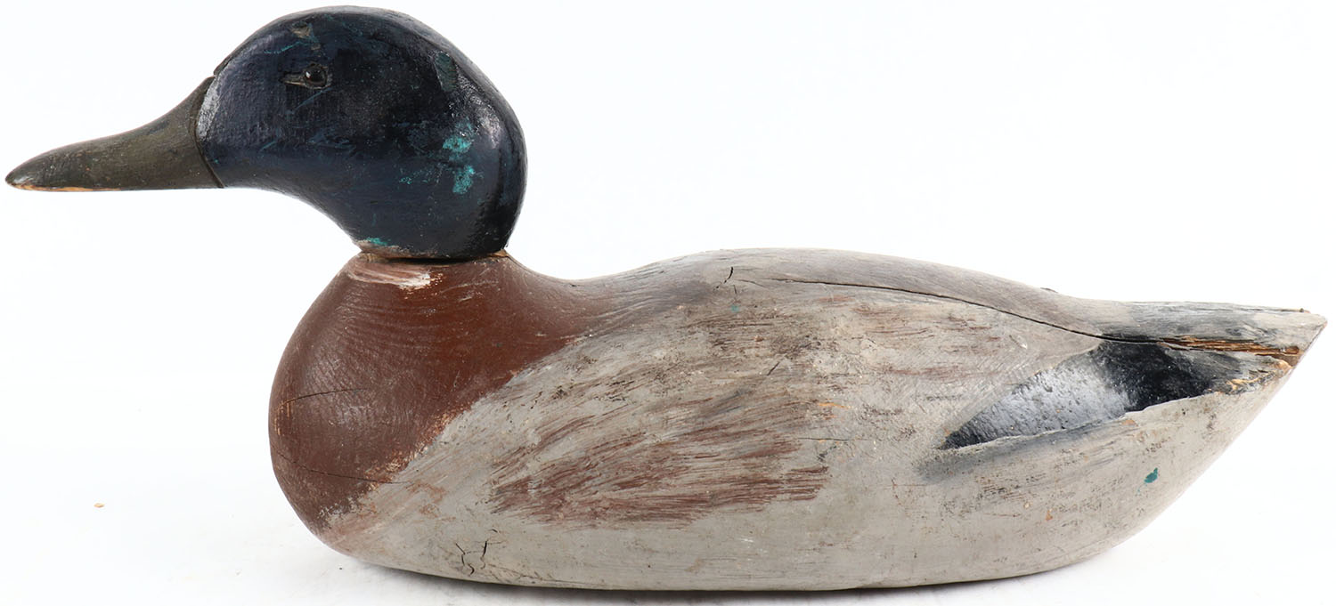 Mallard Drake by unknown maker, glass eyes, solid wood, has age cracks on back and bottom, head is loose, repainted. Grade: Very Good ++ - Value: 20 to 80