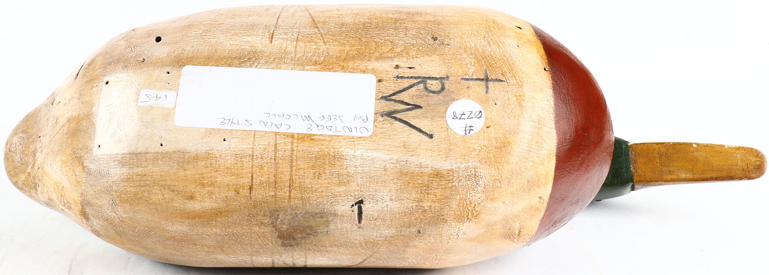 Mallard Drake by Jeff Mccall, glass eyes, structurally excellent, solid wood, branded RW on bottom original paint. Grade: Excellent + - Value: 30 to 200