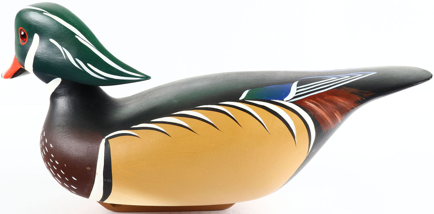 Woodduck Drake by Bill Schauber, Chestertown Maryland, glass eyes, hollow wood, original paint, structurally excellent, signed on bottom. Grade: MINT - Value: 50 to 150