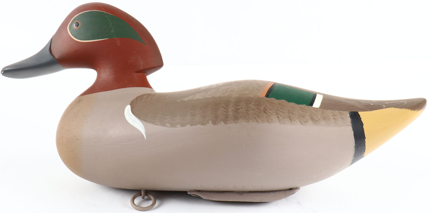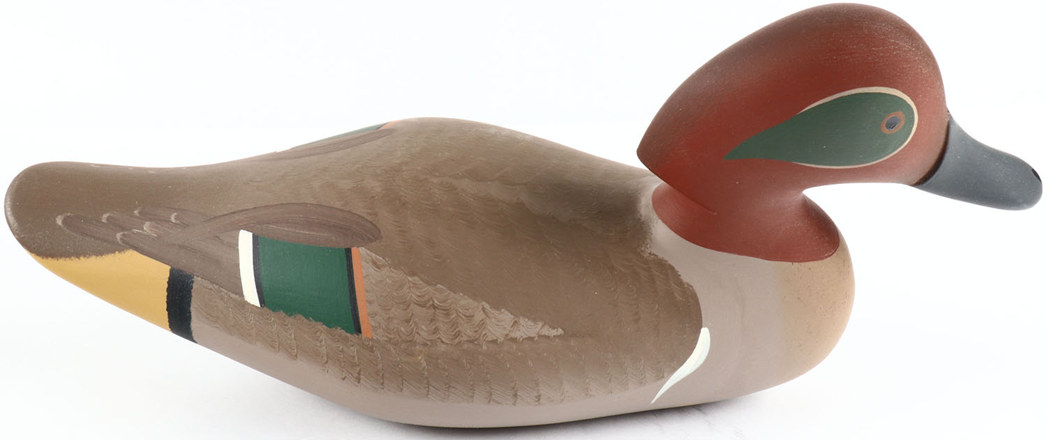 Green Wing Teal Drake by Bryon Bodt, Churchille MD, painted eyes, solid wood, original paint, structurally excellent, branded BODT on bottom. Grade: MINT - Value: 50 to 100