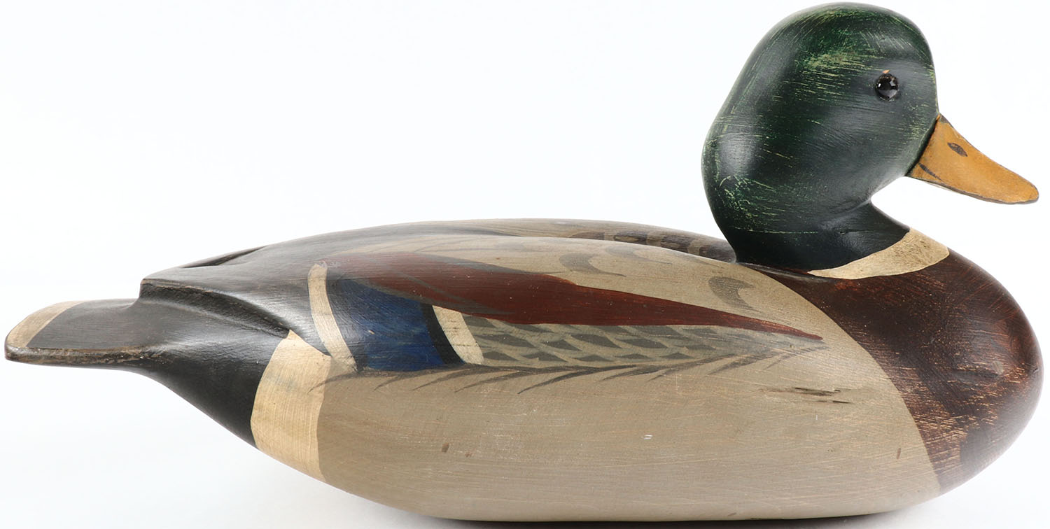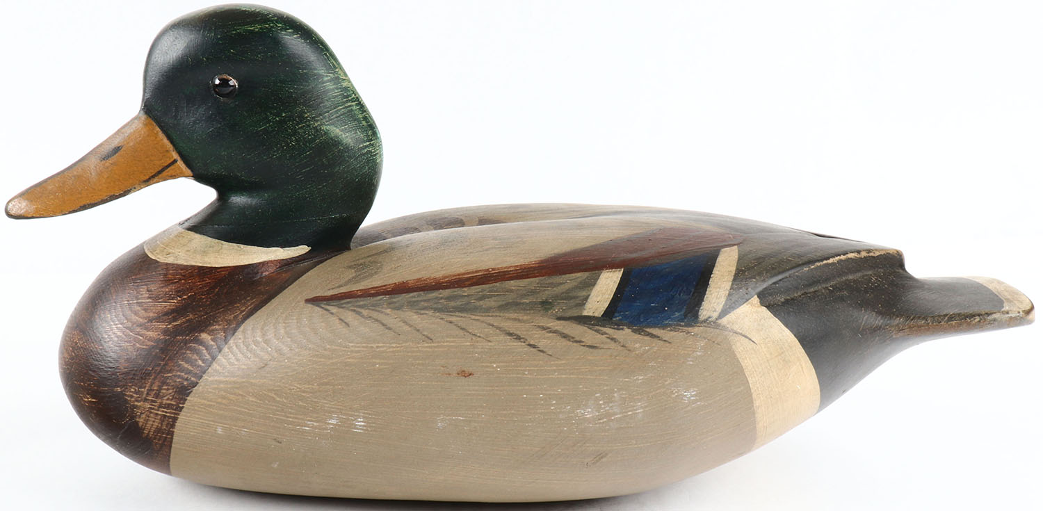 Mallard Drake by T.J.'S RIG, glass eyes, solid wood, original paint, structurally excellent, branded T.J.'S RIG on bottom. Grade: Excellent ++ - Value: 50 to 100