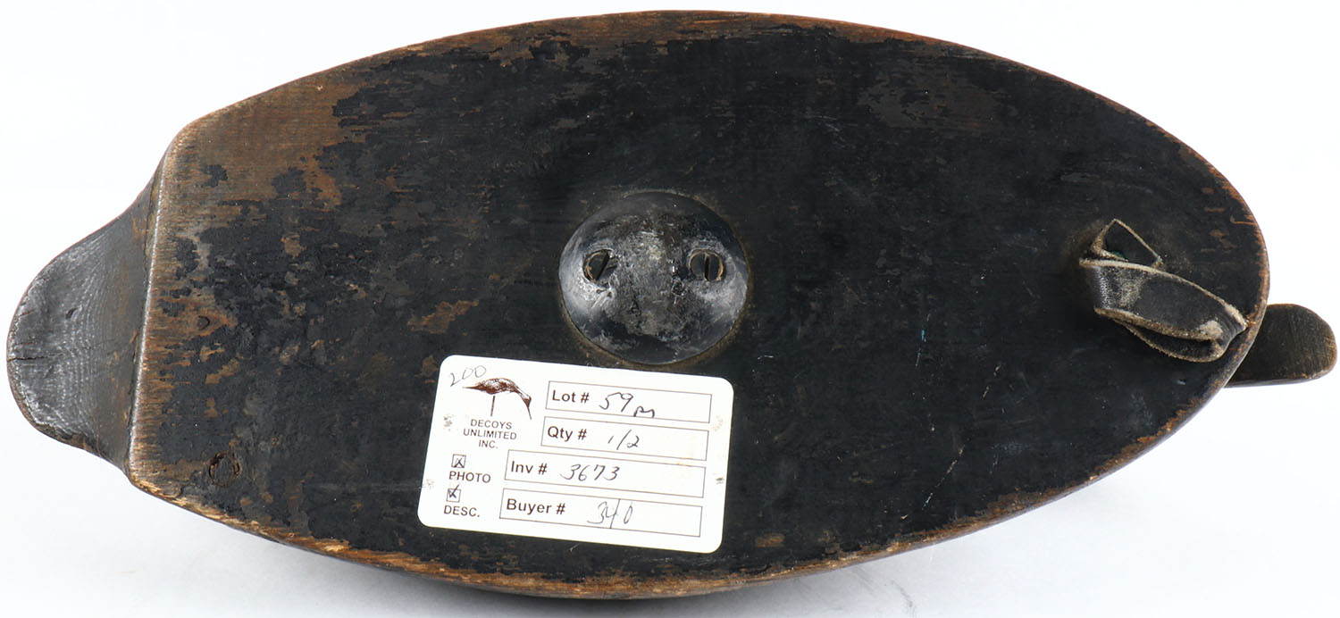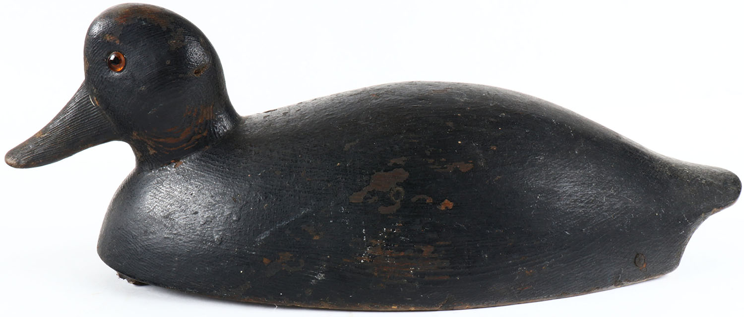 Bluebill Drake by unknown maker, glass eyes, solid wood, original paint, neck is cracked. Grade: Very Good ++ - Value: 50 to 150