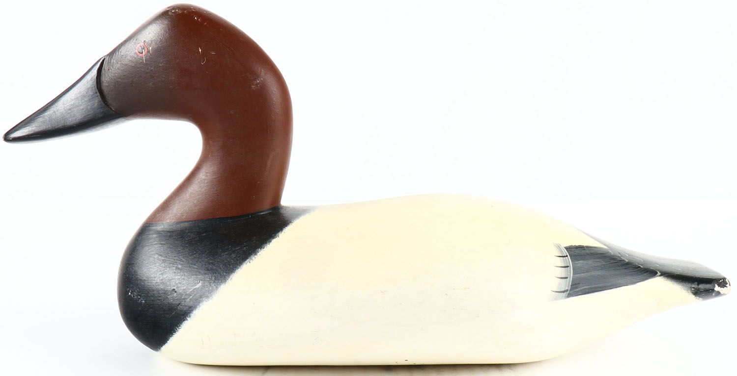 Canvasback Drake by Bryon Bodt, Churchille MD, painted eyes, hollow wood, original paint, structurally excellent, signed on bottom. Grade: Excellent ++ - Value: 50 to 100