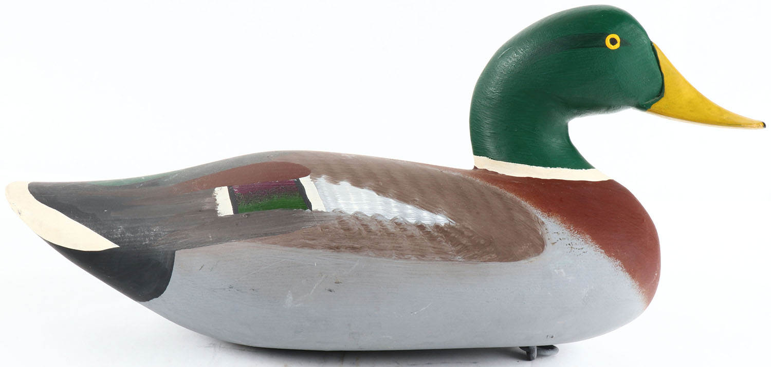 Mallard Drake by unknown maker in MD, painted eyes, solid wood, repainted, has age crack on bottom. Grade: Very Good ++ - Value: 50 to 100