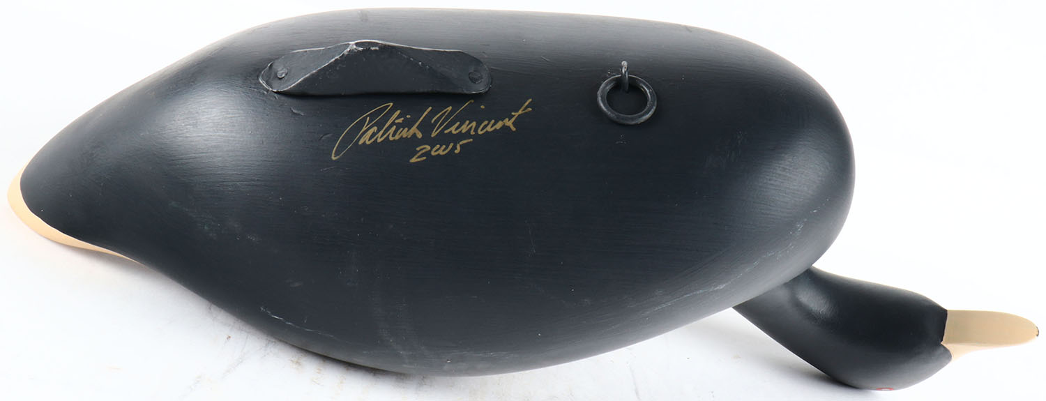 Coot by Patrick ''Pat'' Vincent, Churchville, MD, painted eyes, solid wood, original paint, structurally excellent, signed on bottom. Grade: MINT - Value: 50 to 100
