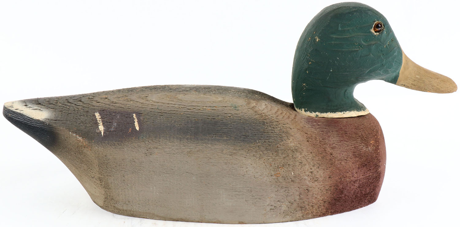 Mallard Drake by Herter's Inc, glass eyes, hollow wood, original paint, head comes off. Grade: Very Good ++ - Value: 50 to 100