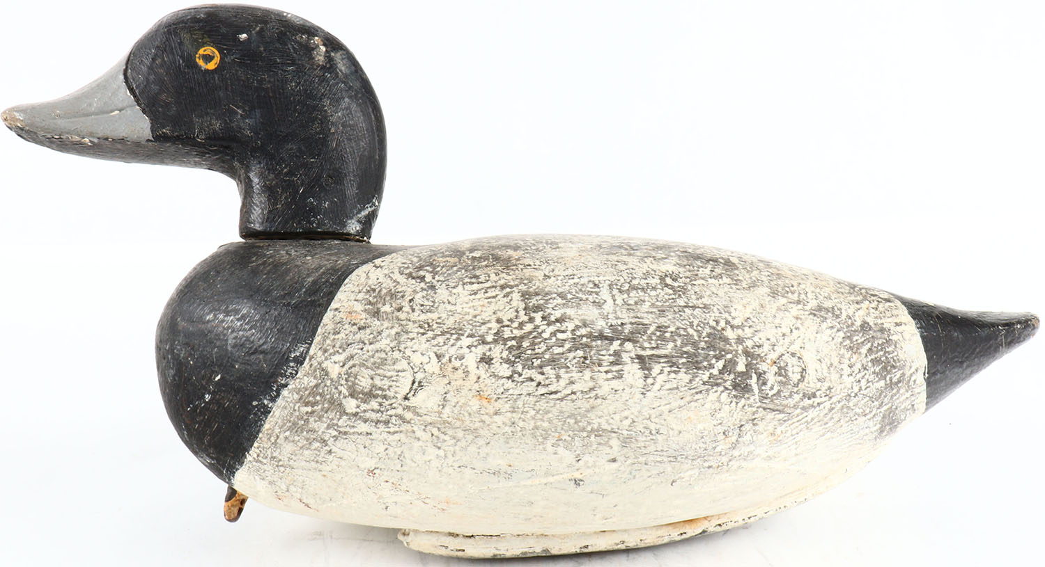 Bluebill Drake by unknown maker, painted eyes, solid wood, original paint, has age cracks on back. Grade: Very Good ++ - Value: 50 to 100