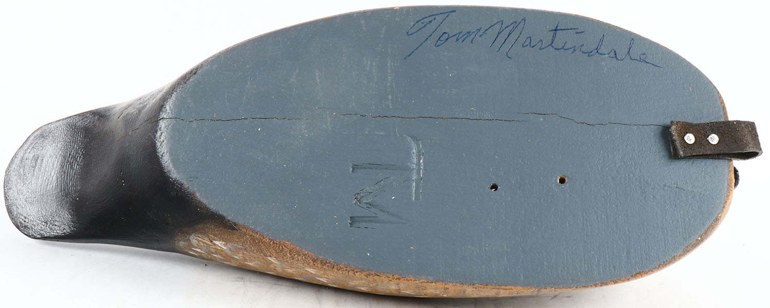Woodduck Hen by Tom Martindale, Ontario, Canada, glass eyes, solid wood, original paint, structurally excellent, branded TM on bottom and signed. Grade: MINT - Value: 50 to 100
