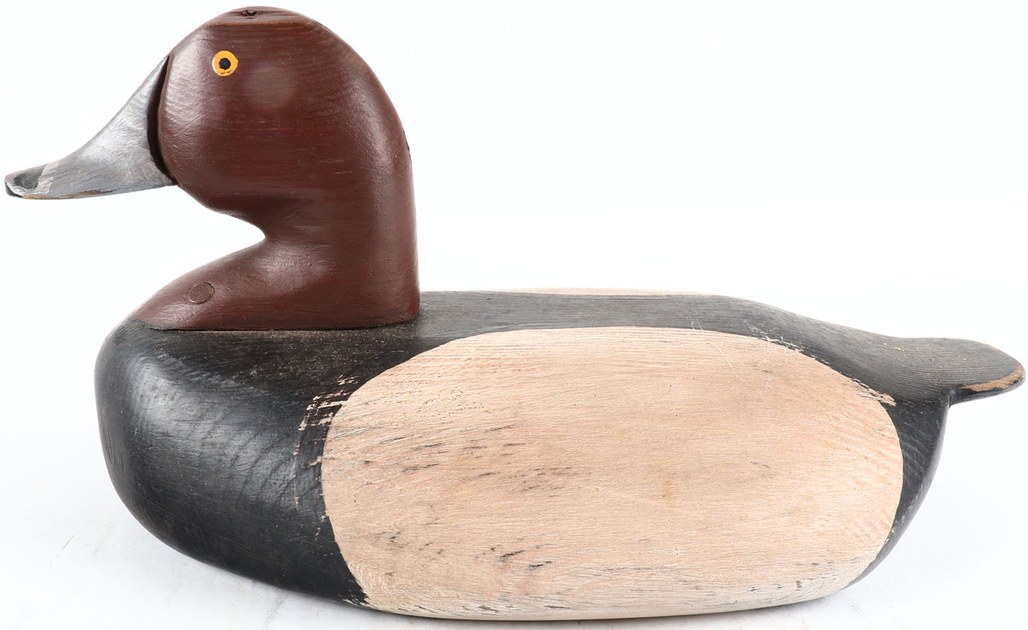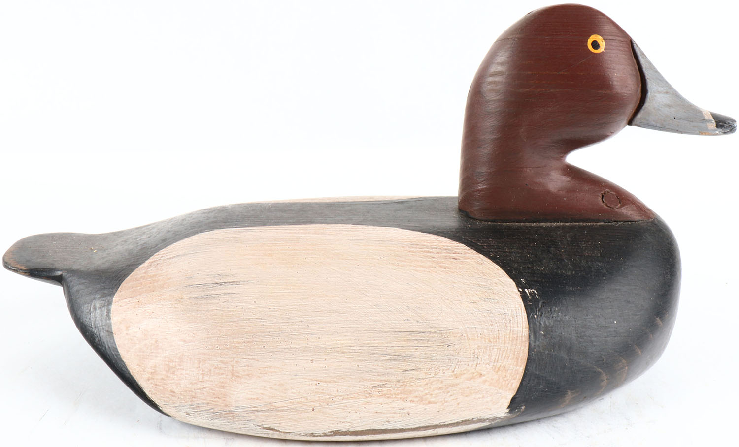 Redhead Drake by Joe Racine, Upper Bay Decoys, Elkton Maryland, painted eyes, solid wood, original paint, structurally excellent, branded JR on bottom and signed. Grade: Excellent + - Value: 40 to 80