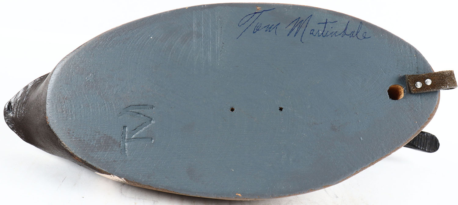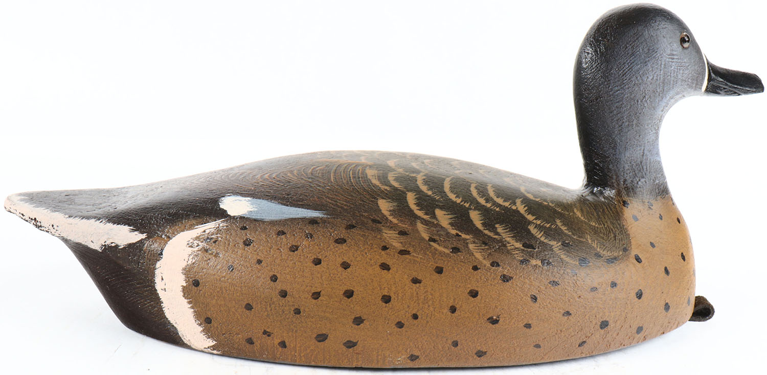 Blue Wing Teal Drake by Tom Martindale, Ontario, Canada, glass eyes, solid wood, original paint, structurally excellent, branded TM on bottom and signed. Grade: MINT - Value: 50 to 100