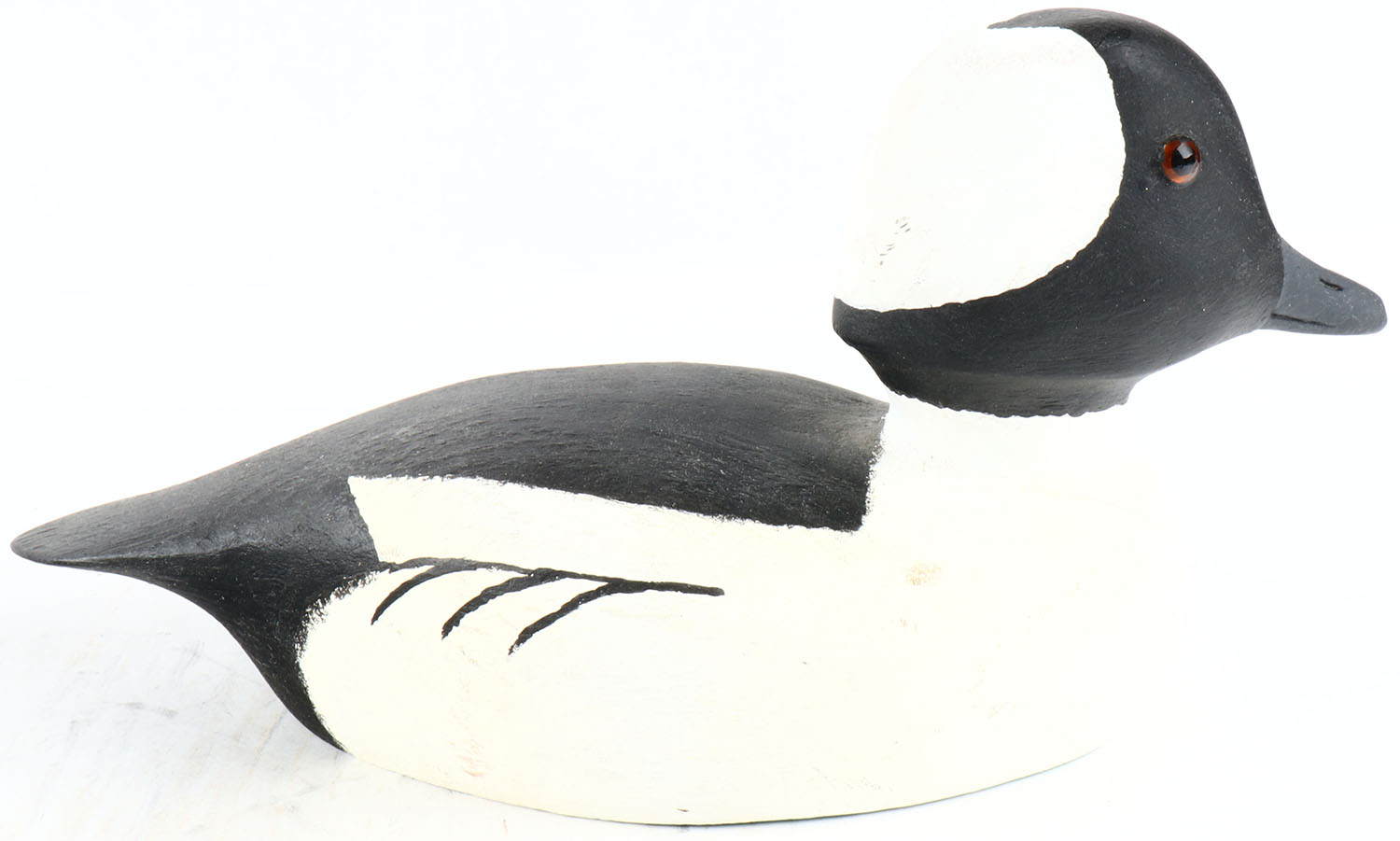 Bufflehead Drake by Maynard Caine, Ontario, Canada, glass eyes, hollow wood, original paint, structurally excellent, branded M on bottom. Grade: MINT - Value: 50 to 100