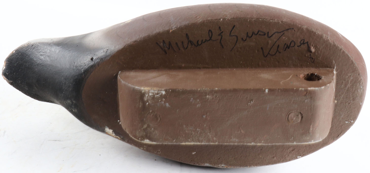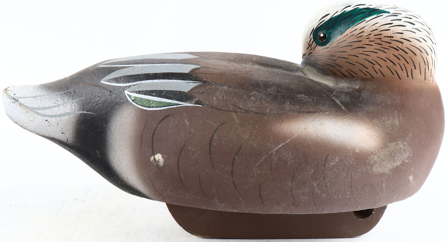 Preening Widgeon Drake by Michael and Susan Veasy, glass eyes, solid wood, original paint, tail is slightly cracked, signed on bottom. Grade: Very Good ++ - Value: 50 to 100