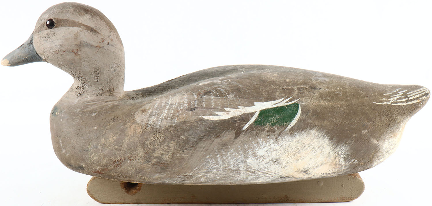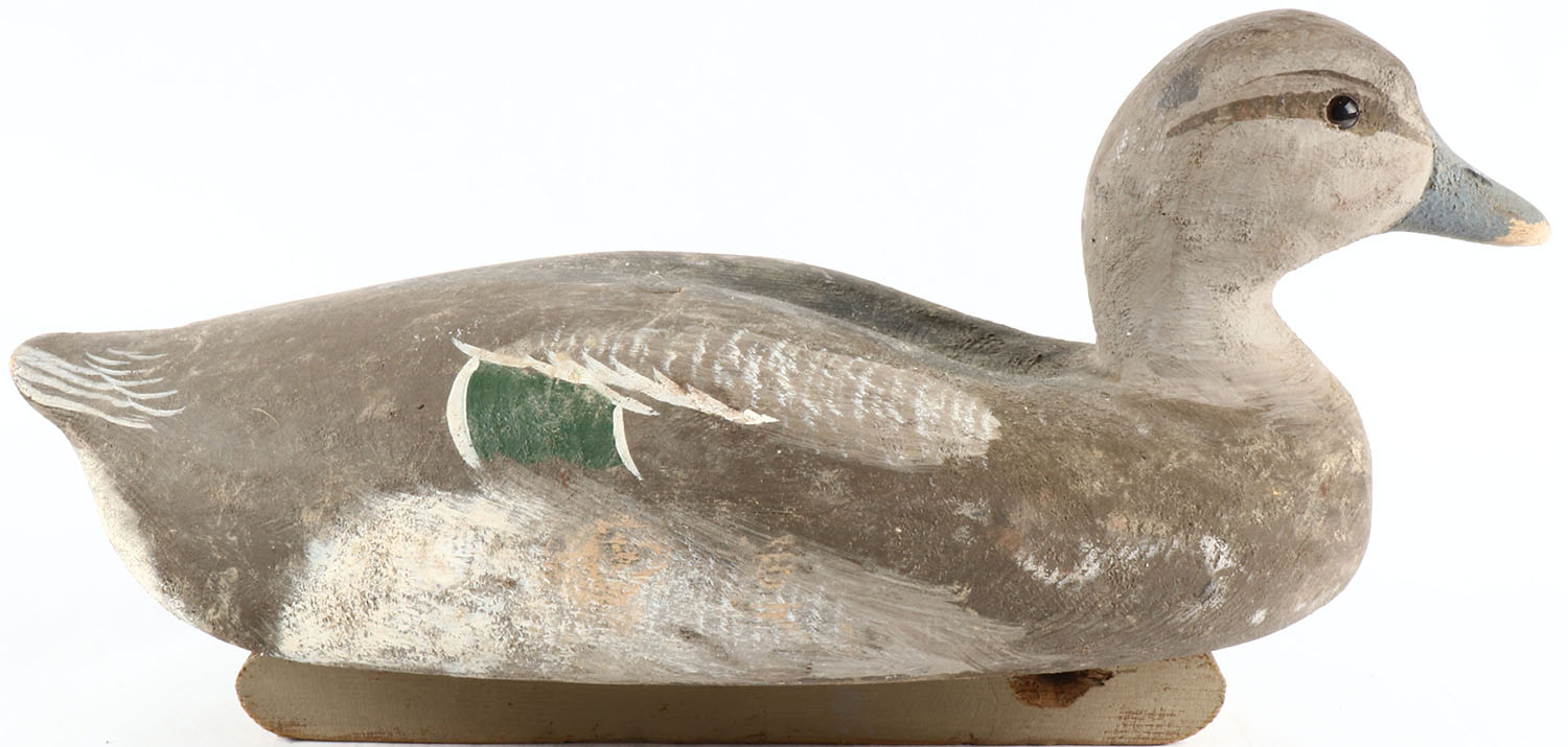 Widgeon by W. Mathewson, glass eyes, solid wood, original paint, structurally excellent, branded by W. MATHEWSON on bottom. Grade: Very Good ++ - Value: 50 to 100
