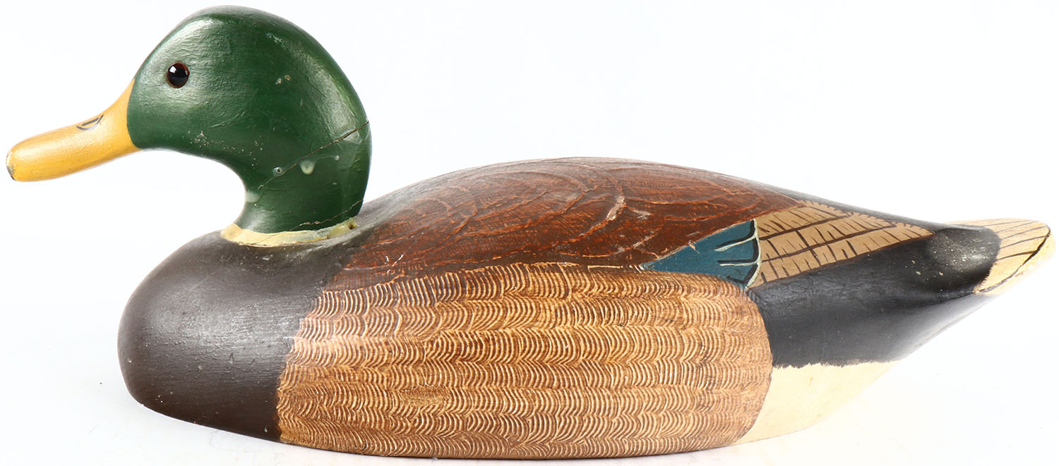 Mallard Drake by unknown maker, glass eyes, solid wood, original paint with comb painting, structurally excellent. Grade: Excellent ++ - Value: 50 to 100