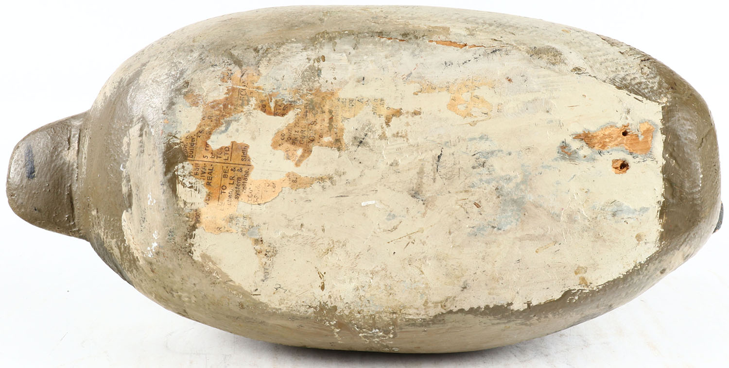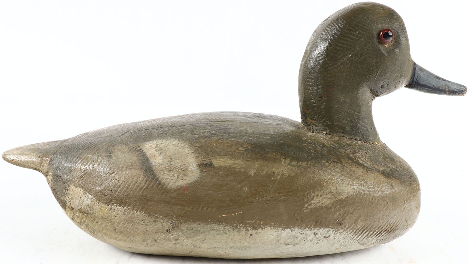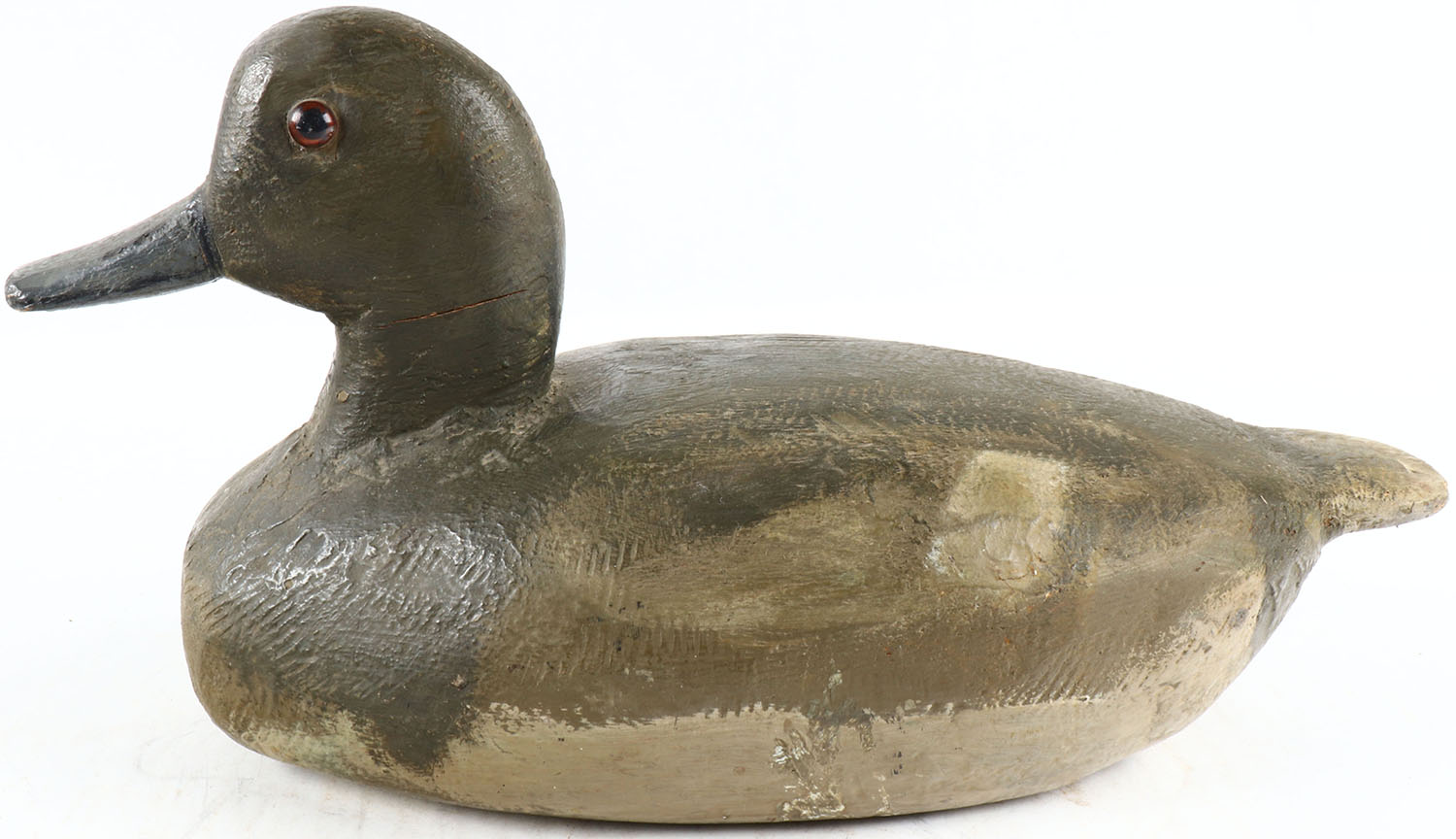 Bluebill Hen by unknown maker, glass eyes, solid wood, original paint, has hairline age crack on neck. Grade: Very Good ++ - Value: 50 to 100