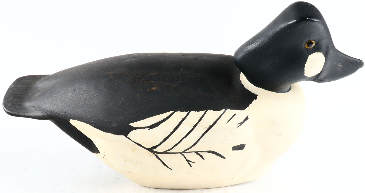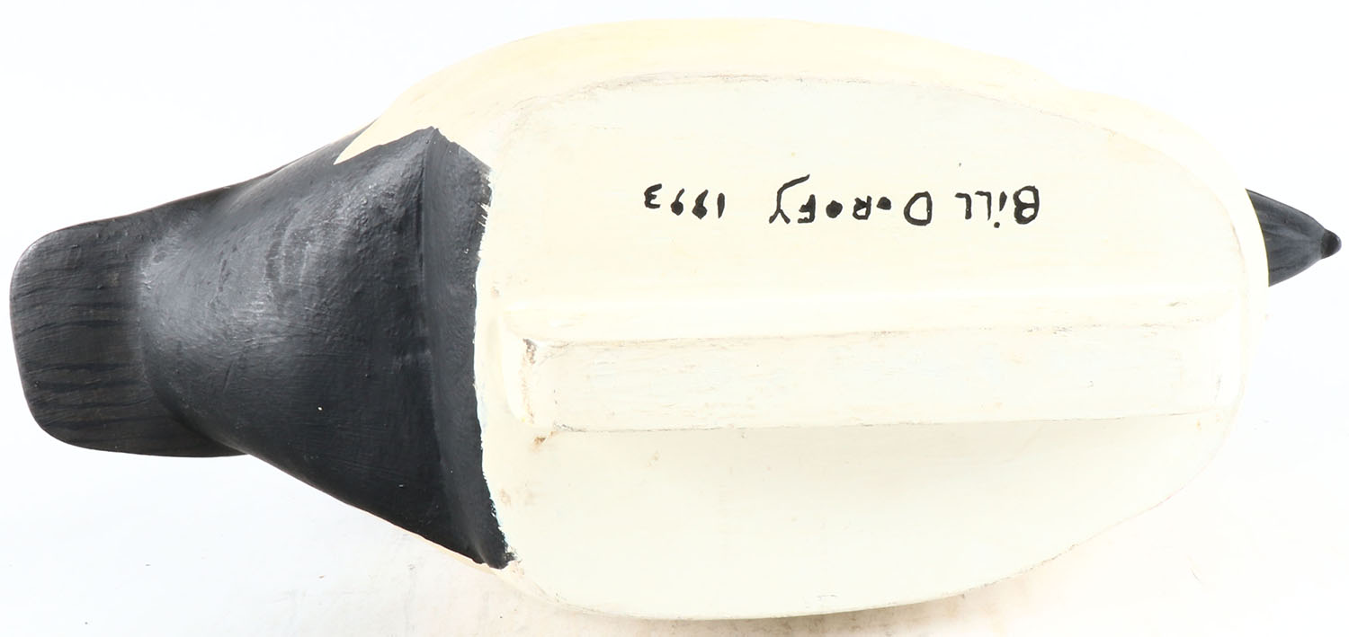 Goldeneye Drake by Bill Dorofy, glass eyes, hollow wood, original paint, structurally excellent, signed on bottom. Grade: Excellent + - Value: 50 to 100