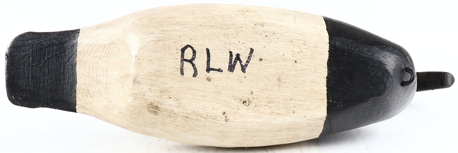 Canvasback Drake by Romie L Waterfield, North Carolina, glass eyes, hollow wood, original paint, structurally excellent, branded RLW on bottom. Grade: Excellent - Value: 50 to 100