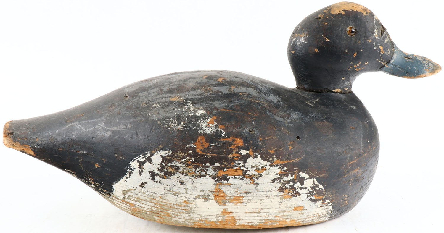 Bluebill Drake by unknown maker, glass eyes, solid wood, original paint, head is loose. Grade: Very Good ++ - Value: 50 to 100