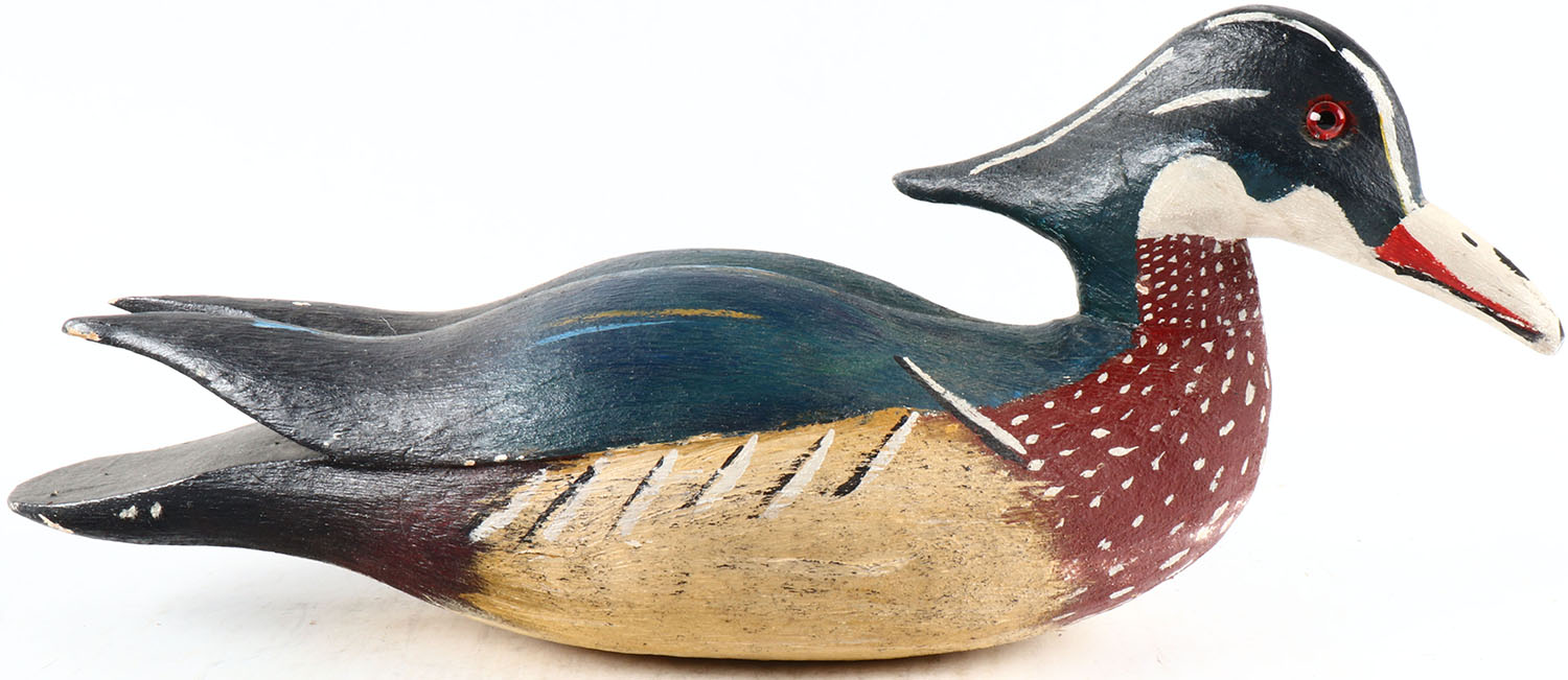Woodduck Drake by American Waterfowl, Jack Brackney, glass eyes, hollow wood, original paint, structurally excellent, signed on bottom. Grade: Excellent ++ - Value: 50 to 100
