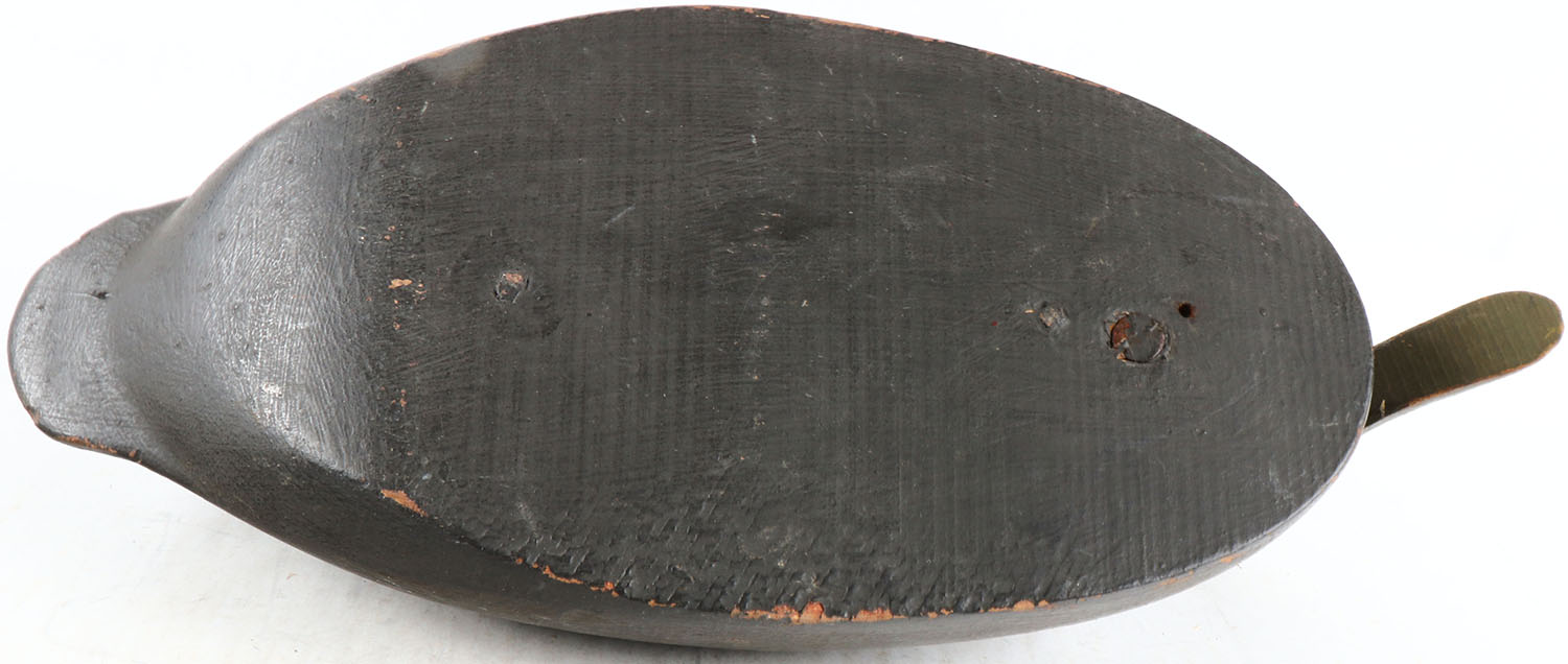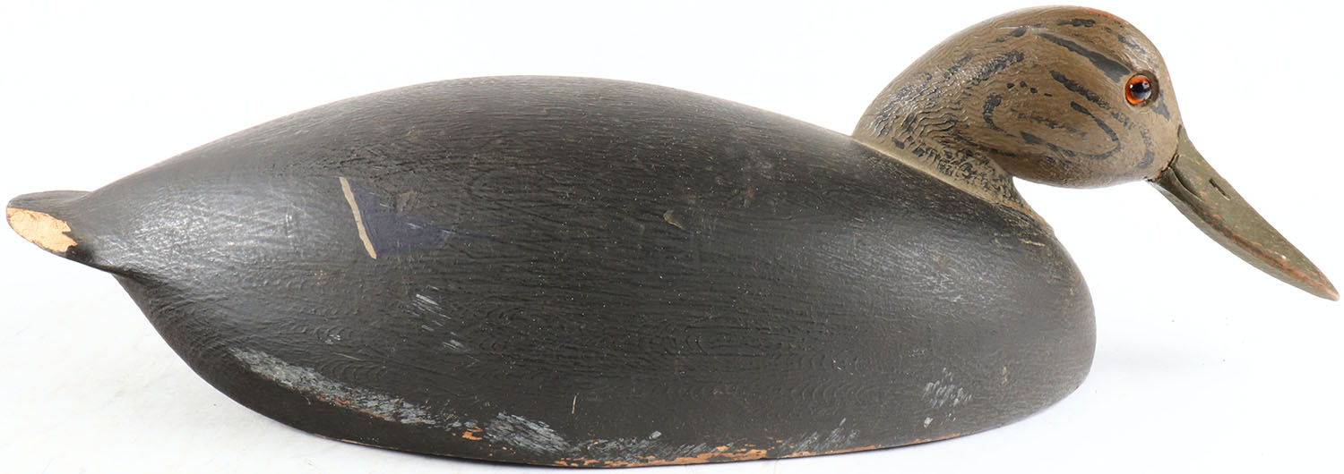 Black Duck by unknown maker, glass eyes, solid wood, original paint, tail is broken, bill has been repaired. Grade: Very Good + - Value: 50 to 100